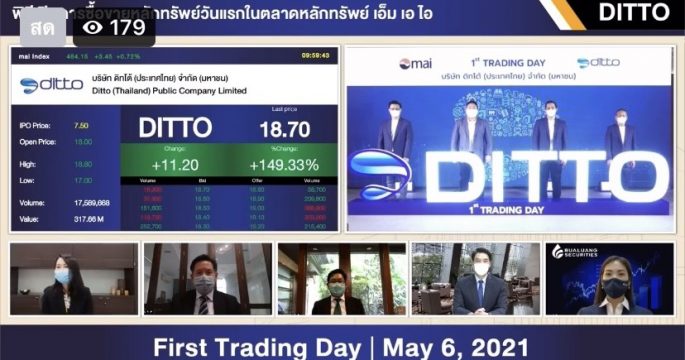 หุ้น DITTO เปิดเทรดวันแรกที่ 18 บาท เพิ่มขึ้น 10.50 บาท (+140%) จากราคาขาย IPO ที่ 7.50 บาท/หุ้น