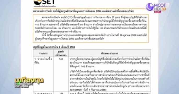 กรุงเทพฯ 12 ต.ค.-ตลาดหลักทรัพย์ฯ เตือนผู้ลงทุนศึกษาข้อมูล งบการเงิน ติดตามคำชี้แจงของบริษัท วันทูวัน คอนแทคส์ จำกัด (มหาชน) หรือ OTO วันนี้ ตลาดหลักทรัพย์แห่งประเทศไทย ขอให้บมจ.วันทูวัน คอนแทคส์ (OTO) ชี้แจงข้อมูลในงบการเงินงวด 6 เดือน ปี 66 ซึ่งผู้สอบบัญชีมีข้อสังเกตเกี่ยวกับการที่บริษัทจ่ายเงินมัดจำค่าซื้อที่ดินก่อนที่คณะกรรมการบริษัทอนุมัติให้ทำสัญญาจะซื้อจะขายซื้อที่ดิน 140 ล้านบาท นอกจากนี้ บริษัทมีขาดทุนสุทธิ 96 ล้านบาท ส่วนใหญ่มาจากการขาดทุนจากเงินลงทุนในตราสารทุนของบริษัทจดทะเบียน 134 ล้านบาท อีกทั้งยังมีรายการเงินให้กู้ยืม 100 ล้านบาท แก่บริษัทจดทะเบียนอีกแห่งหนึ่งที่บริษัทลงทุนและมีผลขาดทุนจากการดำเนินงาน ทั้งนี้ ให้ชี้แจงข้อมูลผ่านระบบเผยแพร่ข้อมูลของตลาดหลักทรัพย์ฯ ภายในวันที่ 26 ต.ค.66 และขอให้ผู้ลงทุนศึกษาข้อมูลงบการเงินของ OTO และติดตามคำชี้แจงของบริษัท อ่านรายละเอียด https://weblink.set.or.th/dat/news/202310/1164NWS121020230900300494T.pdf .-สำนักข่าวไทย