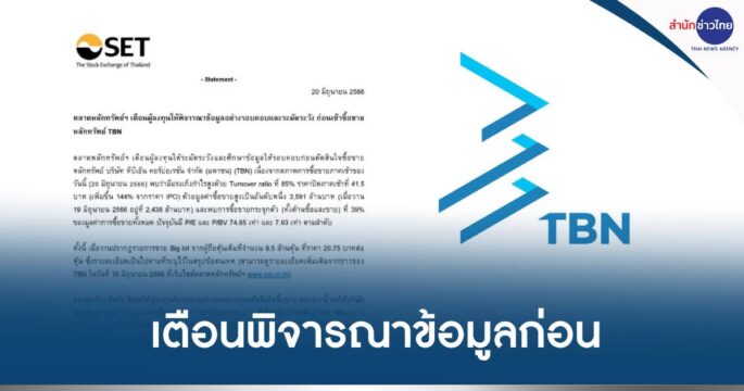 ตลาดหลักทรัพย์ฯ เตือนผู้ลงทุนให้พิจารณาข้อมูลอย่างรอบคอบและระมัดระวัง ก่อนเข้าซื้อขายหลักทรัพย์ TBN
