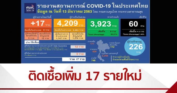 กรุงเทพ 13 ธ.ค.- ศบค.รายงานสถานการณ์โควิด-19 วันอาทิตย์ที่ 13 ธ.ค. 2563 พบผู้ป่วยรายใหม่ 17 ราย แบ่งเป็นผู้เดินทางจากต่างประเทศไม่เข้าสถานกักกัน 5 ราย และผู้ที่อยู่ในสถานกักกัน 12 ราย ทำให้มีผู้ป่วยยืนยันสะสม 4,209 ราย ขณะที่มีผู้ที่รักษาหายแล้วอีก 8 คน รวมรักษาหายแล้วเป็น 3,923 ราย ส่วนยอดผู้เสียชีวิตสะสมยังอยู่ที่ 60 ราย.- สำนักข่าวไทย