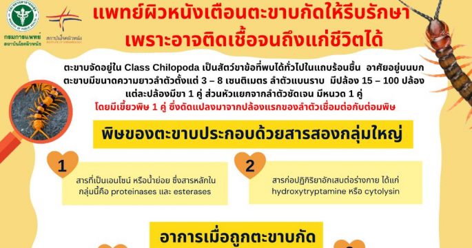 กรมการแพทย์ เตือนผู้ที่ถูกตะขาบกัดควรรีบไปพบแพทย์เพื่อรับการตรวจรักษา เพราะอาจมีความเสี่ยงจากการติดเชื้อเข้าสู่กระแสเลือดจนถึงขั้นเสียชีวิตได้