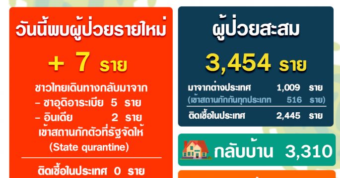 วันนี้ มีผู้ติดเชื้อรายใหม่ 7 ราย เป็นผู้ที่เดินทางกลับจากต่างประเทศ (ซาอุดิอาระเบีย 5 ราย, อินเดีย 2 ราย)