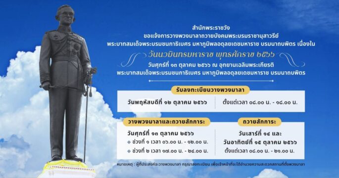 สำนักพระราชวัง ขอแจ้งการวางพวงมาลาถวายบังคมพระบรมราชานุสาวรีย์ฯ เนื่องใน “วันนวมินทรมหาราช”