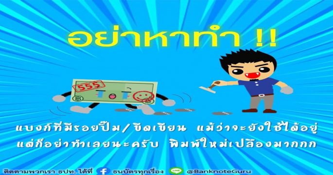 ธปท.ขอความร่วมมือไม่ให้ประทับตราหรือขีดเขียนใด ๆ ลงบนธนบัตร แม้ว่าธนบัตรที่มีรอยประทับตรายังสามารถใช้ชำระหนี้ได้ตามกฎหมาย