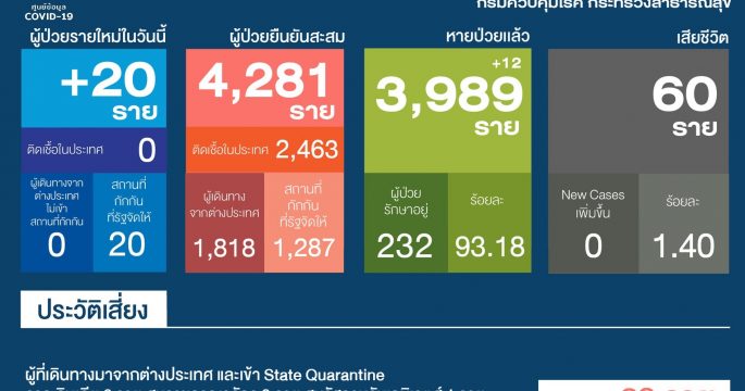 The COVID-19 Information Center reported 20 new cases of the coronavirus disease 2019 as the total rose to 4,281.