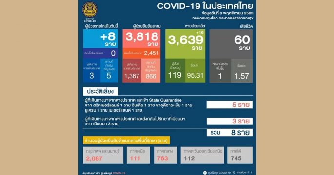 Thailand on Friday reported one new death from Covid-19, bringing the country’s total death toll to 60.