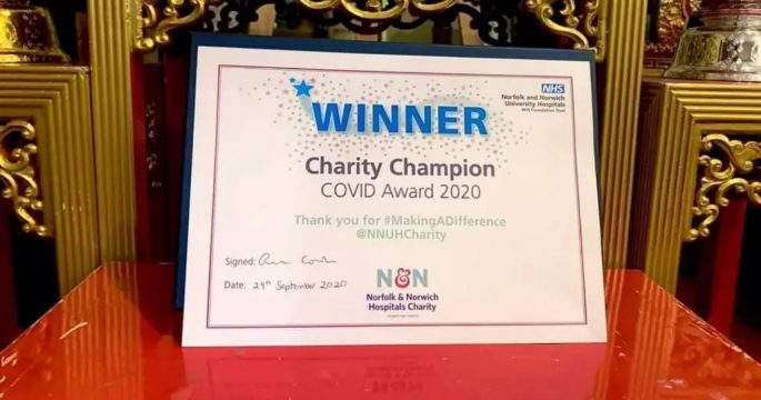 Wat Arun Norfolk UK won the Charity Champion Covid Award after the Thai temple set up an almshouse to support medical personnel and the poor and handle the Covid-19 situation well.
