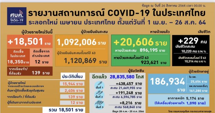 ทำเนียบ 26 ส.ค.-ศบค.เผยผู้ติดเชื้อโควิด-19 รายใหม่ 18,501 ราย ผู้หายป่วย 20,606 ราย เสียชีวิต 229 ราย ผู้สูงอายุ 60 ปีขึ้นไปเสียชีวิตมากที่สุด