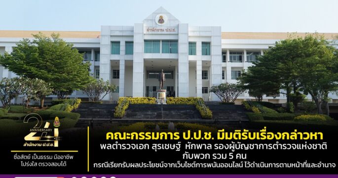 ป.ป.ช. วันนี้ (5 มี.ค.) ป.ป.ช.แจงมติเสียงข้างมากรับพิจารณาคดี “บิ๊กโจ๊ก” กับพวก เอี่ยวเครือข่ายเว็บพนันมินนี่ พร้อมเรียกคืนสำนวน “ภาคภูมิ” ลูกน้องมือขวา ยืนยันเป็นอำนาจตามกฎหมาย