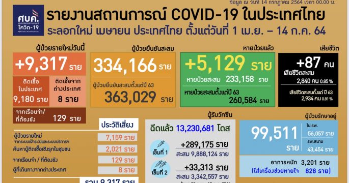 ศบค.รายงานผู้ติดเชื้อใหม่ 9,317 ราย เสียชีวิต 87 คน “อสม.-หญิงตั้งครรภ์” เสียชีวิต ผู้ป่วยอาการหนัก 3,201 ราย หายป่วยเพิ่มอีก 5,129 ราย