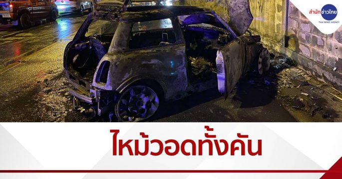 มินิคูเปอร์ไฟไหม้วอดทั้งคัน หลังพุ่งชนท้ายกระบะ ไถลไปกระแทกกำแพง ภายในซอยกรุงเทพกรีฑา 8 เขตบางกะปิ ส่วนคนขับรถหรูมีคนมารับตัวไป บอกยอมชดใช้ค่าเสียหายทุกอย่าง