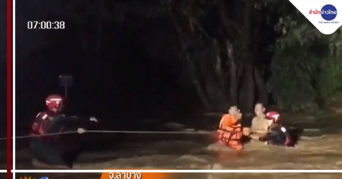 กู้ภัยโยงเชือกผูกกับต้นไม้ ช่วยชาวบ้าน 2 คน ติดกลางแม่น้ำวัง ต.ร่องเคาะ อ.วังเหนือ จ.ลำปาง ท่ามกลางกระแสน้ำไหลเชี่ยว มีชาวบ้านมามุงดูเหตุการณ์จำนวนมาก เจ้าหน้าที่ใช้เวลานานกว่า 2 ชั่วโมง ช่วยทั้งคู่ได้อย่างปลอดภัย