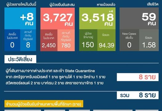 สำนักข่าวไทย 23 ต.ค. – ศบค.รายงาน พบผู้ป่วยโควิด-19 เพิ่ม 8 คน ทำให้ยอดผู้ป่วยสะสม 3,727 คน และ รักษาหาย 3,518 คน เสียชีวิต 59 คน ศูนย์บริหารสถานการณ์โควิด-19 (ศบค.)รายงาน วันนี้ (23 ต.ค.)พบผู้ป่วยติดเชื้อโควิด-19 เพิ่ม 8 คน ทำให้มียอดผู้ป่วยสะสมรวม 3,727 คน รักษาหายแล้ว 3,518 คน เสียชีวิต 59 คน โดยรายละเอียดของผู้ป่วย 8 คน เป็นผู้เดินทางกลับมาจากต่างประเทศทั้งหมดประกอบด้วย 1. หญิงไทยอายุ 31 ปี เดินทางกลับมาสหรัฐอาหรับเอมิเรตส์ อาชีพเจ้าหน้าที่สายการบิน 2. ชายไทยอายุ 54ปี อาชีพประกอบธุรกิจส่วนตัว เดินทางกลับมาจากอิหร่าน 3.ชายไทยอายุ 32 ปี อาชีพทหาร […]