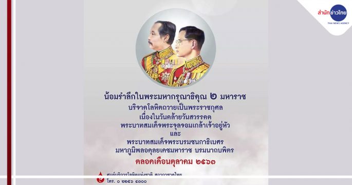 สำนักข่าวไทย 4 ต.ค. –ศูนย์บริการโลหิตแห่งชาติ สภากาชาดไทย ชวนคนไทย ร่วมกันบริจาคโลหิต ตลอดเดือนตุลาคม เนื่องจากเป็นเดือนสำคัญของคนไทย น้อมรำลึกถึงพระมหากรุณาธิการ ของ 2 พระมหากษัตริย์ที่มีคุณูปการแก่ปวงชน ทั้ง ล้นเกล้าร.5 และร.9 รศ. พญ.ดุจใจ ชัยวานิชศิริ ผอ.ศูนย์บริการโลหิตแห่งชาติ สภากาชาดไทย เปิดเผยว่า ในเดือนตุลาคมของทุกปี มีวันสำคัญของคนไทย ทั้ง วันคล้ายวันสวรรคตของพระบาทสมเด็จพระจุลจอมเกล้าเจ้าอยู่หัว รัชกาลที่ 5 ในวันที่ 23 ตุลาคม และวันที่ 13 ตุลาคม ซึ่งเป็นวันคล้ายวันสวรรคตของพระบาทสมเด็จพระบรมชนกาธิเบศร มหาภูมิพลอดุลยเดชมหาราช บรมนาถบพิตร รัชกาลที่ 9 กษัตริย์ผู้เป็น ที่รัก เทิดทูน และเป็นศูนย์รวมใจของคนไทยทั้งชาติ จึงขอเชิญชวนพสกนิกรชาวไทย ร่วมแสดงออกถึงความจงรักภักดี บริจาคโลหิตถวายเป็นพระราชกุศล ตลอดเดือนตุลาคม 2563 ณ ศูนย์บริการโลหิตแห่งชาติ และภาคบริการโลหิตแห่งชาติ 12 แห่งทั่วประเทศ ได้แก่ จ.ลพบุรี […]