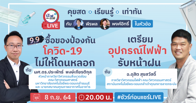 พบกับ : พีรพล อนุตรโสตถิ์ และ พงศ์อิทธิ์ เชิดชูวงศ์อัปเดตแวดวงข่าวปลอมข้อมูลเท็จในแบบ “คุยสด เรียนรู้ เท่าทัน” 🎯 ชวนคุยในหัวข้อ : 9.9 ซื้อของป้องกันโควิด-19 ไม่ให้โดนหลอก🔎 กับ ผศ.ดร.ประพัทธ์ พงษ์เกียรติกุล หัวหน้าภาควิชาวิศวกรรมสิ่งแวดล้อม คณะวิศวกรรมศาสตร์ มหาวิทยาลัยเทคโนโลยีพระจอมเกล้าธนบุรี และ นายกสมาคมคุณภาพอากาศในอาคาร 🎯 และอีกหัวข้อที่น่าสนใจไม่แพ้กัน : เตรียมอุปกรณ์ไฟฟ้า รับหน้าฝน🔎 กับ อ.ดุสิต สุขสวัสดิ์ ภาควิชาวิศวกรรมไฟฟ้า คณะวิศวกรรมศาสตร์ สถาบันเทคโนโลยีพระจอมเกล้าเจ้าคุณทหารลาดกระบัง วันและเวลาในการรับชม : วันพุธ ที่ 8 กันยายน 2564 เวลา 20.00 น.YouTube : https://www.youtube.com/watch?v=NWM4DQPbxJYFacebook : https://www.facebook.com/266168127080435/posts/1452221875141715/ หากได้รับอะไรมา อย่าเพิ่งแชร์ต่อ ส่งมาตรวจสอบกับ “ศูนย์ชัวร์ก่อนแชร์” LINE :: […]