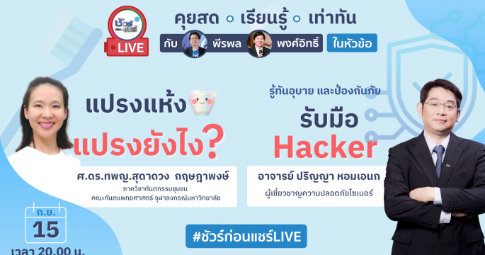 พบกับ : พีรพล อนุตรโสตถิ์ และ พงศ์อิทธิ์ เชิดชูวงศ์อัปเดตแวดวงข่าวปลอมข้อมูลเท็จในแบบ “คุยสด เรียนรู้ เท่าทัน” 🎯 ช่วงที่ 1 ชวนคุยในหัวข้อ : แปรงแห้ง แปรงยังไง ?🔎 กับ ศ.ดร.ทพญ.สุดาดวง กฤษฎาพงษ์ ภาควิชาทันตกรรมชุมชน คณะทันตแพทยศาสตร์ จุฬาลงกรณ์มหาวิทยาลัย 🎯 ช่วงที่ 2 ชวนคุยในหัวข้อ : รู้ทันอุบาย “เจาะ 3 ชั้น” และป้องกันภัย รับมือ Hacker🔎 กับ อาจารย์ ปริญญา หอมเอนก ผู้เชี่ยวชาญความปลอดภัยไซเบอร์ วันและเวลาในการรับชม : วันพุธ ที่ 15 กันยายน 2564 เวลา 20.00 น.YouTube : https://youtu.be/WG6C_OOr5RMFacebook : https://www.facebook.com/266168127080435/posts/1457036834660219/ […]