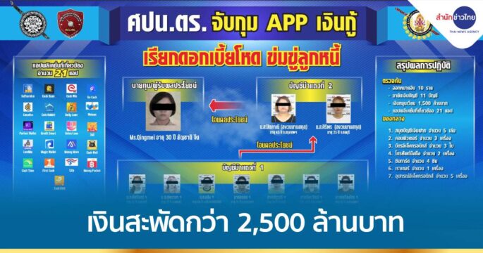 ศปน.ตร.ร่วมกับตำรวจหลายหน่วย ปฏิบัติการทลายแก๊งปล่อยเงินกู้นอกระบบดอกเบี้ยโหดผ่านแอปฯ ส่งข้อความข่มขู่ลูกหนี้ รวบนายทุนจีนพร้อมพวก 19 ราย พบเงินสะพัดในระบบกว่า 2,500 ล้านบาท