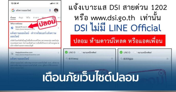 ดีเอสไอ เตือนภัยมิจฉาชีพทำเว็บไซต์ “แจ้งความออนไลน์ปลอม” ย้ำเว็บไซต์ดีเอสไอ คือ www.dsi.go.th เท่านั้น และจะไม่มีเจ้าหน้าที่ดีเอสไอติดต่อผู้เสียหายให้แจ้งความออนไลน์ทาง Line@ หรือให้โหลดแอปฯ หรือให้โอนเงินเป็นค่าดำเนินการใด ๆ