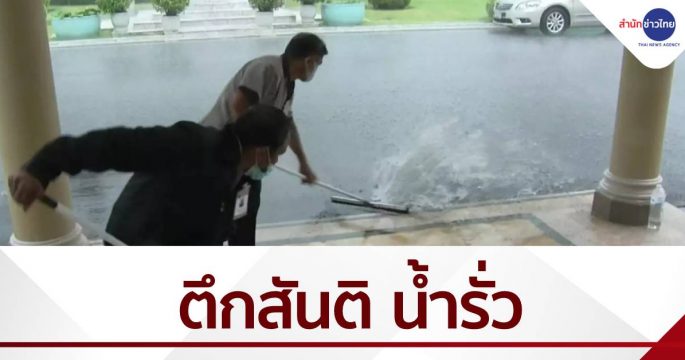 ฝนถล่มทำเนียบรัฐบาล เพดานตึกสันติไมตรี น้ำรั่ว เจ้าหน้าที่รีบนำถังรองกันเปื้อน