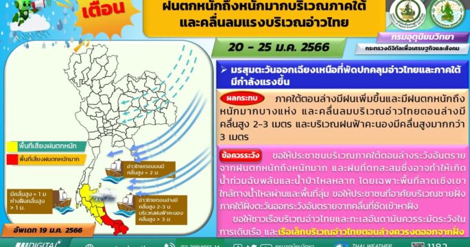 ปภ.แจ้ง 11 จังหวัดภาคใต้ เตรียมรับมือน้ำท่วมฉับพลัน-น้ำป่าไหลหลาก-คลื่นลมแรง ช่วง 20 – 25 ม.ค. 66 ด้าน มท.สั่งเฝ้าระวังสถานการณ์ภัย เตรียมพร้อมเผชิญเหตุ ช่วยเหลือประชาชน