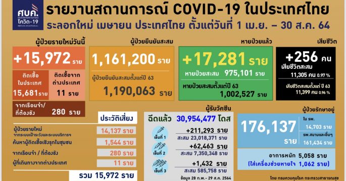 ทำเนียบรัฐบาล 30 ส.ค.- ศบค.เร่งฉีดวัคซีนหญิงตั้งครรภ์ “ผู้สูงอายุ และ 7 กลุ่มโรค” หลังพบยอดเสียชีวิตเพิ่มสูงต่อเนื่องวันนี้ มีผู้ติดเชื้อรายใหม่ 15,972 ราย เสียชีวิต 256 คน