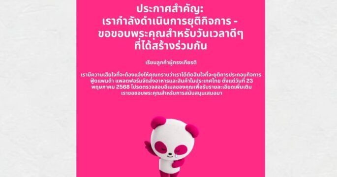 แพลตฟอร์มฟู้ดดิลิเวอร์รี่ foodpanda Thailand ประกาศแจ้งยุติการให้บริการแอปพลิเคชัน foodpanda มีผลตั้งแต่วันที่ 23 พ.ค.68