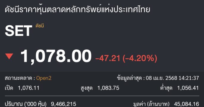 หุ้นไทยเปิดตลาดร่วง 51 จุด เช้านี้ ดัชนี SET อ่อนค่าสุดที่ 1,074 จุด ทองคำร่วง-บาทอ่อนค่าลงหนัก ผันผวน ผลกระทบการขึ้นภาษีของนายโดนัล ทรัมป์ ประธานาธิบดีสหรัฐ เพราะหวั่นเศรษฐกิจทั่วโลกตกต่ำครั้งใหญ่ หรือ Great Depression ในรอบ 100 ปี โบรกเกอร์ปรับลดเป้าหมายดัชนี SET อาจหลุด 1,000 จุด หากภาษีสหรัฐกระทบยาวนาน ลุ้นไทยหลุด
