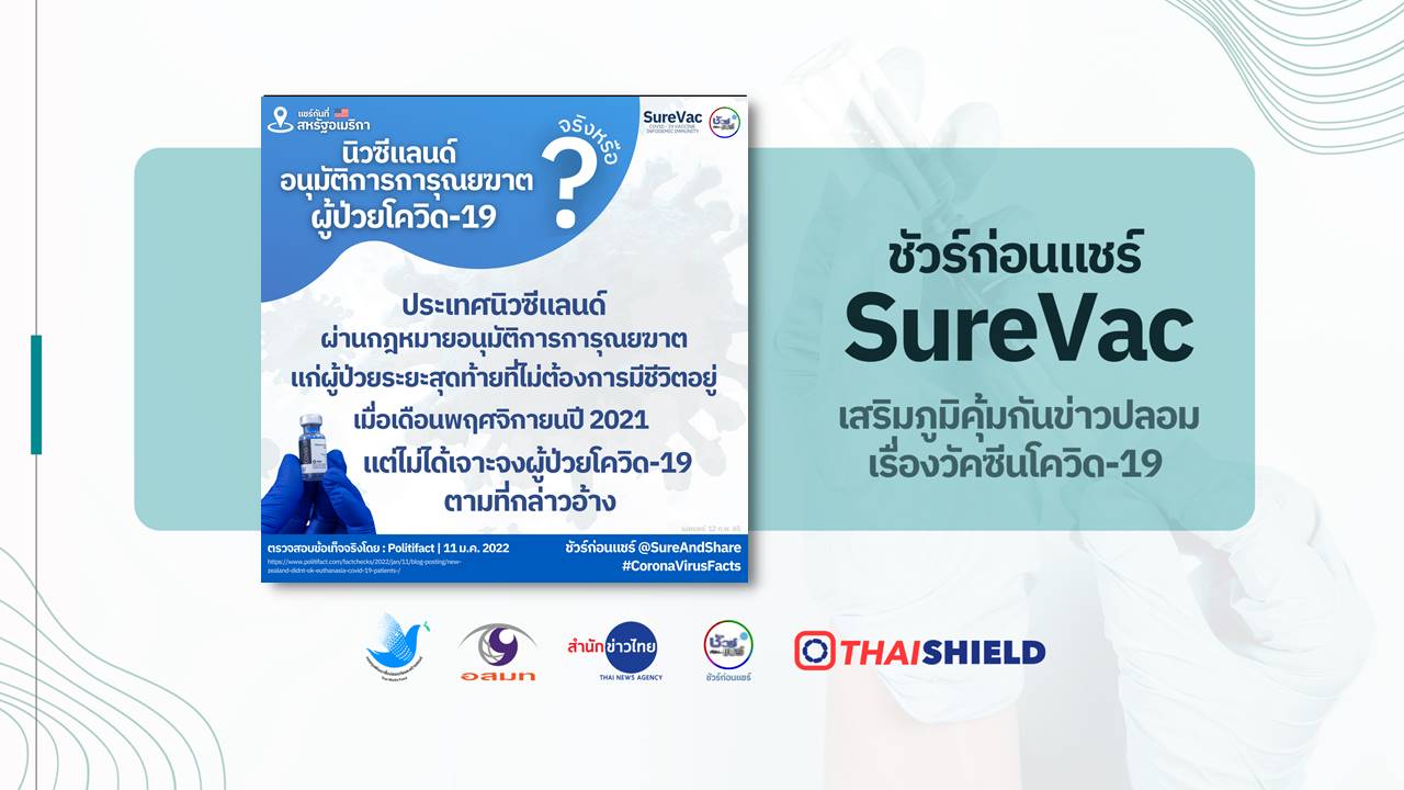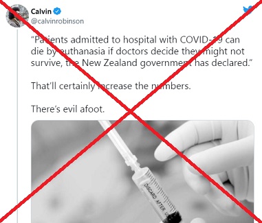 มีข้อมูลบิดเบือนเผยแพร่ทาง Facebook ในประเทศสหรัฐอเมริกา โดยอ้างว่าประเทศนิวซีแลนด์ผ่านกฎหมายอนุมัติการการุณยฆาตสำหรับผู้ป่วยโควิด 19 โดยเฉพาะ เพื่อแก้ปัญหาผู้ป่วยโควิด 19 ล้นโรงพยาบาล