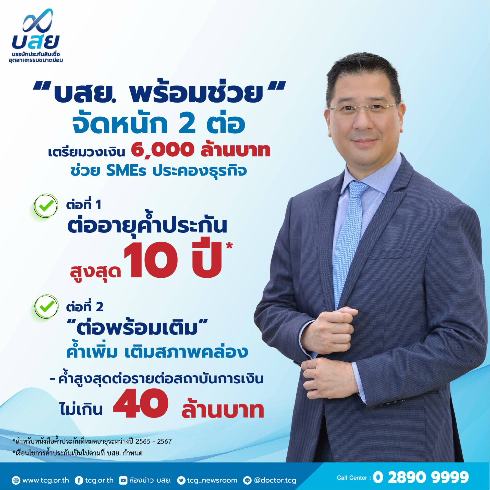 กรุงเทพฯ 19 ส.ค.- บสย. ออกมาตรการใหม่ ช่วยชุบชีวิต SMEs แก้หนี้ยั่งยืนประคองธุรกิจ SMEs ต่ออายุค้ำ 10 ปี “ต่อพร้อมเติม” ค้ำเพิ่ม…เติมสภาพคล่อง วงเงิน 6,000 ล้านบาท
