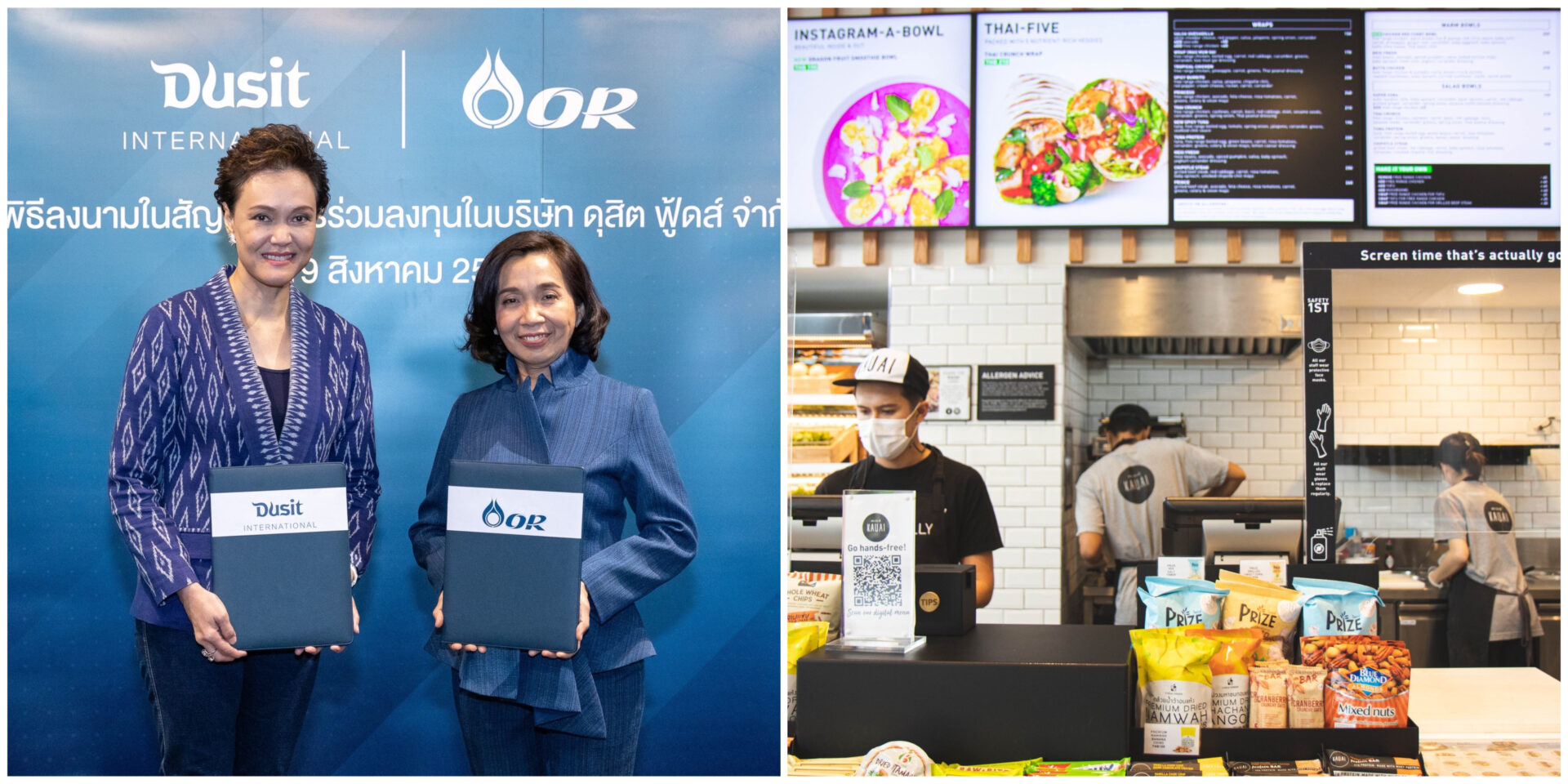 นางสาวจิราพร ขาวสวัสดิ์ ประธานเจ้าหน้าที่บริหารและกรรมการผู้จัดการใหญ่ บริษัท ปตท. น้ำมันและการค้าปลีกจำกัด (มหาชน) หรือ OR และ นางศุภจี สุธรรมพันธุ์ ประธานเจ้าหน้าที่บริหารกลุ่ม บริษัท ดุสิตธานี จำกัด (มหาชน) ร่วมพิธีลงนามในสัญญาการร่วมลงทุนใน บริษัท ดุสิต ฟู้ดส์ จำกัด (DF) ซึ่งเป็นบริษัทย่อยของกลุ่มดุสิตธานี โดยบริษัท มอดูลัส เวนเจอร์ จำกัด หรือ Modulus ซึ่งเป็นบริษัทย่อยของ OR เข้าลงทุนในสัดส่วนร้อยละ 25 ในวงเงิน ไม่เกิน 299.6 ล้านบาท และ กลุ่ม DUSIT มีสัดส่วนการถือหุ้นร้อยละ 75 ของหุ้นสามัญทั้งหมดใน DF ทั้งนี้ DF เป็นบริษัทที่ลงทุนในธุรกิจอาหารตลอดห่วงโซ่อุปทาน โดยเน้นธุรกิจอาหารที่มีการเติบโตสูงและเชื่อมโยงกับธุรกิจอาหารของกลุ่มบริษัทในเครือทั้งธุรกิจโรงแรม และสถาบันการศึกษา