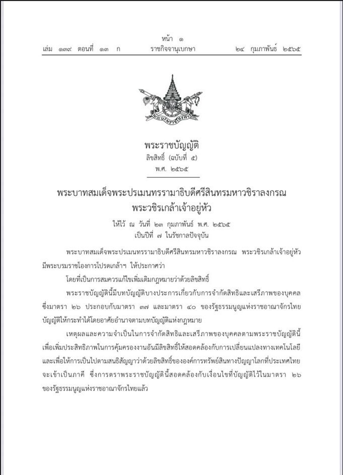 “กรมทรัพย์สินทางปัญญา ผลักดันการแก้ไขพระราชบัญญัติลิขสิทธิ์ได้สำเร็จ โดยจะมีผลบังคับใช้ตั้งแต่วันที่ 23 สิงหาคม 2565 เป็นต้นไป ซึ่งเป็นการปรับปรุงข้อกฎหมายให้เท่าทันการค้ายุคดิจิทัล และยกระดับการคุ้มครองงานลิขสิทธิ์บนสื่อออนไลน์ ตลอดจนสนับสนุนนโยบายซอฟต์พาวเวอร์ของรัฐบาล โดยเจ้าของแพลตฟอร์ม เช่น Facebook YouTube สามารถถอดงานละเมิดลิขสิทธิ์ออกจากระบบได้ทันทีเมื่อได้รับการแจ้งจากเจ้าของลิขสิทธิ์ โดยไม่ต้องผ่านกระบวนการทางศาล รวมทั้งกำหนดบทลงโทษสำหรับผู้ให้บริการ ผู้ผลิต และผู้ขายอุปกรณ์ที่ใช้เพื่อละเมิดลิขสิทธิ์” นายสินิตย์กล่าว