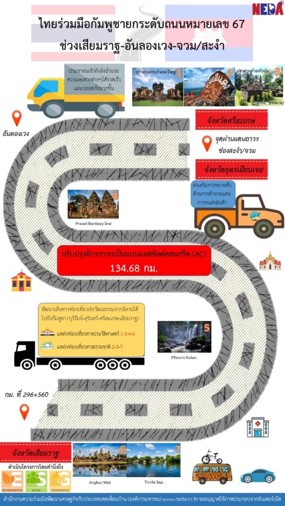 การเชื่อมเส้นทางท่องเที่ยวเชิงวัฒนธรรมจากอีสานใต้ไปยังกัมพูชา ได้แก่ บุรีรัมย์-สุรินทร์-ศรีสะเกษ-เสียมราฐ หรือกลุ่มแหล่งท่องเที่ยวทางประวัติศาสตร์ หรือแหล่งท่องเที่ยวทางธรรมชาติ การผลักดันให้เกิดการพัฒนาเส้นทางเดินรถระหว่างประเทศอย่างเป็นรูปธรรมจะส่งเสริมให้เกิดการพัฒนาสิ่งอำนวยความสะดวกเพื่อสนับสนุนการท่องเที่ยวตลอดแนวเส้นทาง เช่น โรงแรม ร้านอาหาร และการให้บริการรถโดยสาร .-สำนักข่าวไทย