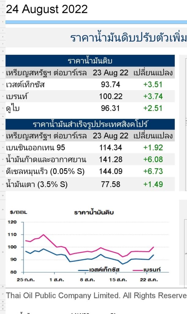 ด้าน บมจ. ไทยออยล์ รายงาน ราคาน้ำมันดิบเวสต์เท็กซัสและเบรนท์ปรับเพิ่ม หลังอุปทานในตลาดมีแนวโน้มตึงตัวขึ้น จากซาอุดีอาระเบียส่งสัญญาณเตรียมพร้อมปรับลดกำลังการผลิตเพื่อพยุงราคาน้ำมัน โดยรัฐมนตรีพลังงานซาอุดีอาระเบียกล่าวว่า กลุ่มโอเปกและชาติพันธมิตร หรือโอเปกพลัส มีความยืดหยุ่นที่จะสามารถปรับเปลี่ยนหนทางในการรับมือกับความท้าทายในตลาดและราคาน้ำมัน ซึ่งรวมถึงการปรับลดกำลังการผลิตเช่นกัน อย่างไรก็ตามโอเปกพลัสอาจไม่ปรับลดกำลังการผลิตทันที และจะดำเนินการให้สอดคล้องกับกรณีที่อิหร่านจะกลับมาส่งออกน้ำมันในตลาด หากอิหร่านบรรลุข้อตกลงนิวเคลียร์กับตะวันตก