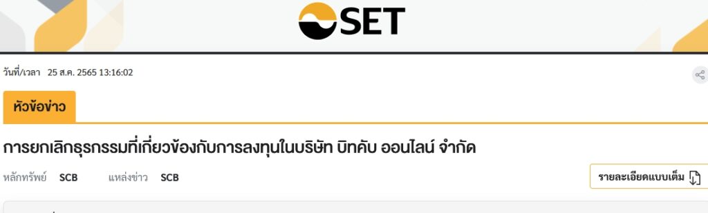 ด้วยเหตุผลดังกล่าวที่ประชุมคณะกรรมการ SCBS ครั้งที่ 15/2565 จึงมีมติให้ SCBS ยกเลิกธุรกรรมการซื้อขายหุ้น โดยให้มีผลตั้งแต่วันที่ 25 ส.ค.65