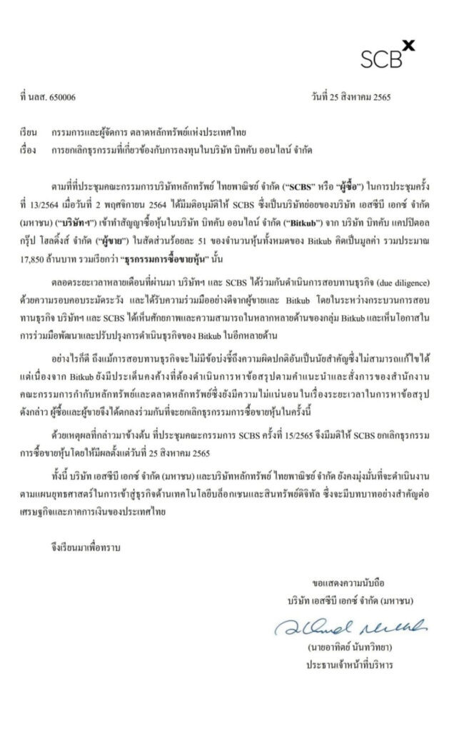 กรุงเทพฯ 25 ส.ค.- SCB ยกเลิกธุรกรรม ซื้อ Bitkub 1.78 หมื่นล้านบาท ระบุธุรกิจไม่ได้ผิดปกติ แต่ยังมีประเด็นต้องขอความชัดเจนจาก ก.ล.ต.