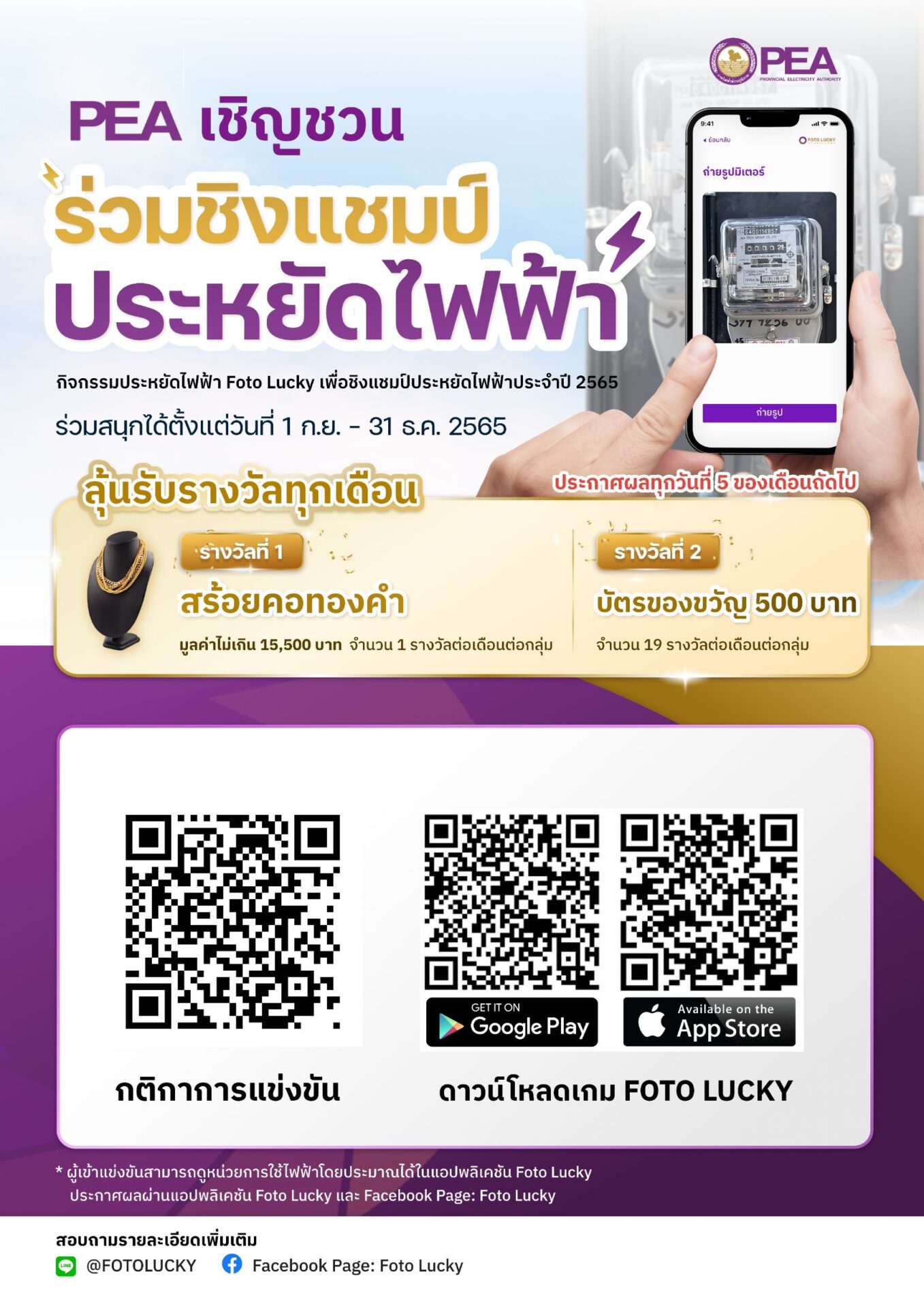 การไฟฟ้าส่วนภูมิภาค หรือ PEA เชิญชวนร่วมชิงแชมป์ประหยัดไฟฟ้า กิจกรรมประหยัดไฟฟ้า Foto Lucky
