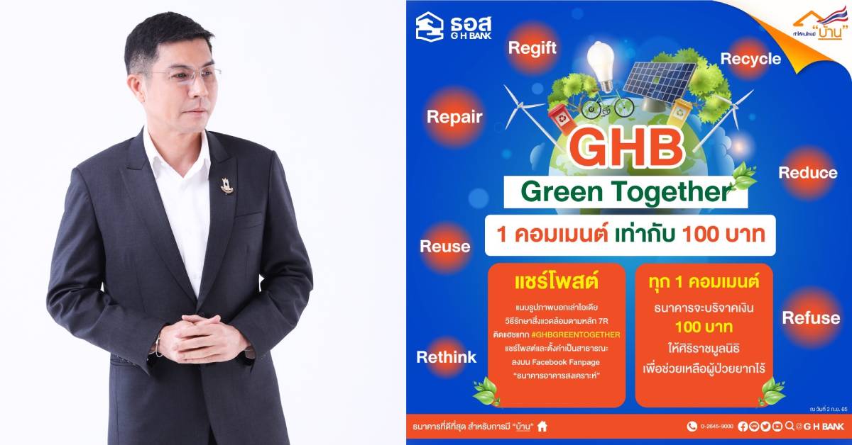 ธนาคารอาคารสงเคราะห์ ชูแคมเปญ “GHB Green Together” ลดภาวะโลกร้อนไปด้วยกัน เปลี่ยนพฤติกรรมสู่ไลฟ์สไตล์กรีน เรียนรู้และลงมือทำอย่างจริงจัง ช่วยลดการเกิดขยะ ลดการปล่อยก๊าซเรือนกระจกทั้งวงจร ตั้งแต่การผลิตจนถึงการบริโภค โดยเปิดพื้นที่ให้ทุกคนได้มีส่วนร่วมแสดงความคิดเห็นใต้โพสต์ของแคมเปญที่ Facebook Fanpage “ธนาคารอาคารสงเคราะห์” แนบภาพบอกเล่าไอเดียหรือวิธีการรักษาสิ่งแวดล้อม ตามหลัก 7R พร้อมแชร์โพสต์เป็นสาธารณะ โดยทุก 1 คอมเมนต์ ธนาคารจะบริจาคเงิน 100 บาท เพื่อช่วยเหลือผู้ป่วยยากไร้ศิริราชมูลนิธิ