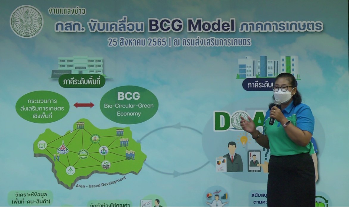 กรมส่งเสริมการเกษตรได้นำแนวทางการขับเคลื่อนภาคการเกษตรด้วย BCG Model ของกระทรวงเกษตรและสหกรณ์ ซึ่งเป็นการพัฒนาเศรษฐกิจใน 3 ด้าน ได้แก่ เศรษฐกิจชีวภาพ เศรษฐกิจหมุนเวียน และเศรษฐกิจสีเขียว มีเป้าหมายพัฒนาภาคการเกษตรสู่ 3 สูง คือ ประสิทธิภาพสูง มาตรฐานสูง และรายได้สูง มาเป็นกรอบในการจัดทำแนวทางการขับเคลื่อนงานส่งเสริมการเกษตรด้วย BCG Model แบบบูรณาการเชิงได้จับมือกับทุกภาคส่วน ทั้งหน่วยงานภาคีระดับพื้นที่และระดับนโยบาย รวมถึงการพัฒนาต่อยอดจากฐานการพัฒนาที่มีอยู่แล้วให้เกิดผลสำเร็จที่ชัดเจนต่อเกษตรกรและชุมชน สร้างรายได้ กระจายผลประโยชน์ พัฒนาเศรษฐกิจชุมชน