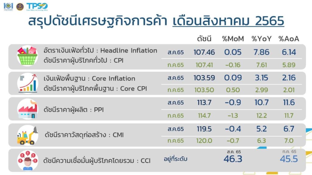 นายรณรงค์ พูลพิพัฒน์ ผู้อำนวยการสำนักงานนโยบายและยุทธศาสตร์การค้า เปิดเผยว่า ดัชนีราคาผู้บริโภคของไทยเดือนสิงหาคม 2565 เท่ากับ 107.46 ใกล้เคียงกับเดือนที่ผ่านมาซึ่งเท่ากับ 107.41 โดยมีอัตราการเปลี่ยนแปลงของดัชนีราคาฯ เพิ่มขึ้นเพียงร้อยละ 0.05 และเมื่อเทียบกับเดือนเดียวกันของปีก่อน ดัชนีราคาฯ ค่อนข้างต่ำ (เท่ากับ99.63) ทำให้อัตราเงินเฟ้อของสิงหาคม 2565 อยู่ที่ร้อยละ 7.86 ซึ่งขยายตัวใกล้เคียงกับเดือนกรกฎาคม 2565 ซึ่งสูงขึ้นร้อยละ 7.61 และคาดว่าเงินเฟ้อของไทยน่าจะถึงจุดสูงสุดแล้ว เหตุผลเนื่องจากในช่วงระยะ 3 เดือนที่ผ่านมา การขึ้นของเงินเฟ้ออยู่ในระดับที่ใกล้เคียงกัน หรืออย่างน้อยอัตราเงินเฟ้อจะทรงตัว นอกจากนี้ เครื่องชี้วัดเศรษฐกิจการค้าอื่น ทั้งดัชนีราคาผู้ผลิต และดัชนีราคาวัสดุก่อสร้าง เมื่อเทียบกับเดือนที่ผ่านมา ปรับลดลงอย่างต่อเนื่อง