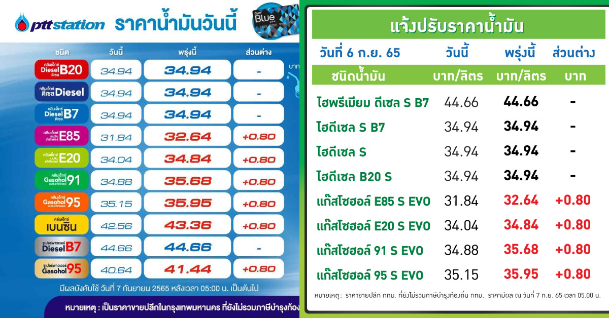ราคาขายปลีกที่ PTT Station จะเป็นดังนี้ ULG = 43.36, GSH95 = 35.95, E20 = 34.84, GSH91 = 35.68, E85 = 32.64, พรีเมี่ยม GSH95 = 41.44, HSD-B7 = 34.94, HSD-B10 = 34.94, HSD-B20 = 34.94, พรีเมี่ยมดีเซล B7 = 44.66 บาทต่อลิตร โดยราคาขายปลีกข้างต้นยังไม่รวมภาษีบำรุงกรุงเทพมหานคร