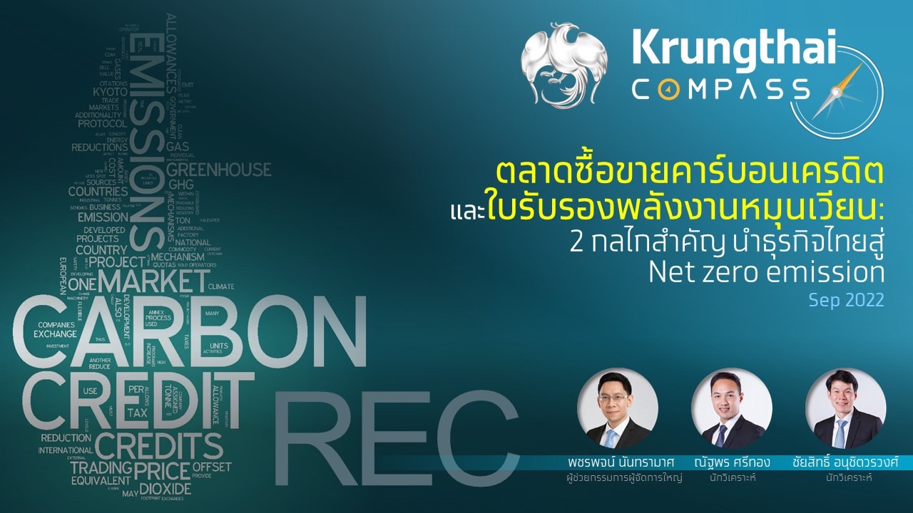 กรุงเทพฯ 8 ก.ย.- ศูนย์วิจัย Krungthai COMPASS ชี้ธุรกิจแนวหน้าด้าน ESG ใช้การซื้อขายคาร์บอนเครดิตและใบรับรองพลังงานหมุนเวียน เป็นเครื่องมือสำคัญในการก้าวสู่ Net Zero Emission และเป้าหมายการใช้พลังงานหมุนเวียน 100% คาดแนวโน้มตลาดโลกและไทยเติบโตสูง แนะผู้ประกอบการเร่งเตรียมความพร้อม ส่วนภาครัฐควรมีมาตรการส่งเสริมอย่างต่อเนื่อง