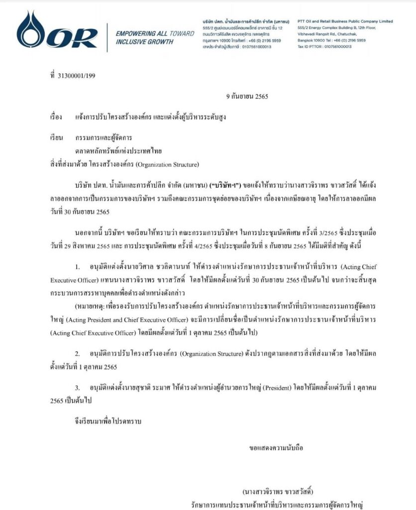 บริษัท ปตท. น้ำมันและการค้าปลีก จำกัด (มหาชน) หรือโออาร์แจ้งตลาดหลักทรัพย์ฯ ว่า นางสาวจิราพร ขาวสวัสดิ์ ได้แจ้งลาออกจากการเป็นกรรมการของบริษัทฯ เนื่องจากเกษียณอายุ โดยให้การลาออกมีผลวันที่ 30 กันยายน 2565