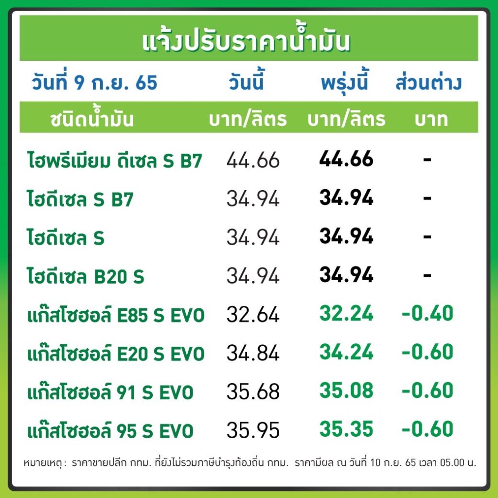 BCP Retail Price : GSH95S EVO 35.35 / GSH91S EVO 35.08 / GSH E20S EVO 34.24 / GSH E85S EVO 32.24 / Hi Diesel B20S 34.94 / Hi Diesel S 34.94 / Hi Diesel S B7 34.94 / Hi Premium Diesel S B7 44.66 (ราคาดังกล่าวยังไม่รวมภาษีบำรุงท้องที่ กทม.) .-สำนักข่าวไทย