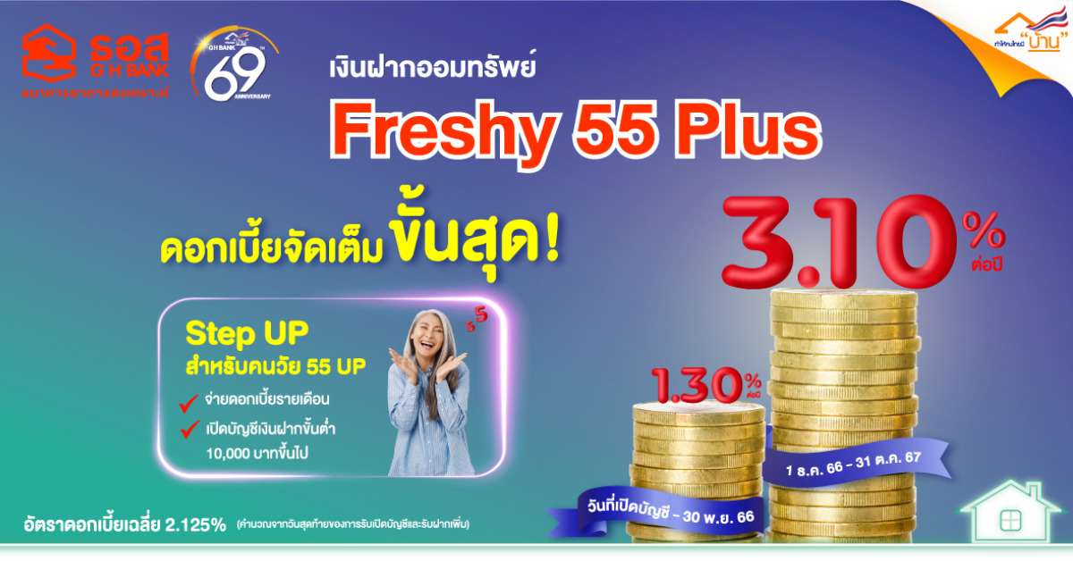 กรุงเทพฯ 9 ก.ย. – ธอส. เปิดตัวเงินฝากออมทรัพย์ Freshy 55 Plus สำหรับคนรักการออมที่มีอายุ 55 ปีขึ้นไป รับดอกเบี้ยแบบจัดเต็มสูงสุด 3.10% ต่อปี