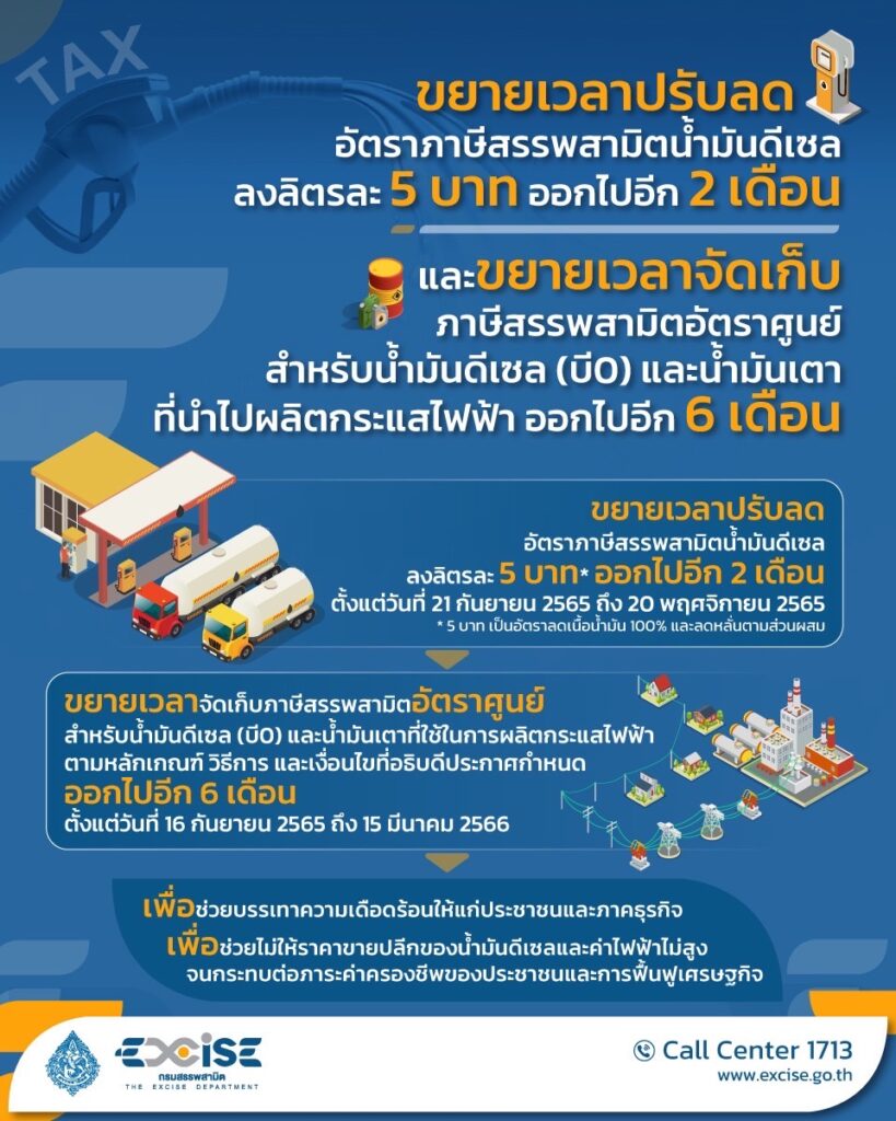 นายอาคม เติมพิทยาไพสิฐ รัฐมนตรีว่าการกระทรวงการคลัง เปิดเผยว่า ที่ประชุมคณะรัฐมนตรี เห็นชอบขยายเวลาปรับลดอัตราภาษีสรรพสามิตน้ำมันดีเซลลงลิตรละ 5 บาท ออกไปอีก2 เดือน ตั้งแต่วันที่ 21 กันยายน 2565 ถึง 20 พฤศจิกายน 2565 และเห็นชอบ ขยายเวลายกเว้นภาษีสรรพสามิตดีเซล (บี0) และน้ำมันเตา ใช้ในการผลิตกระแสไฟฟ้า ขยายเวลาออกไปอีก 6 เดือน ตั้งแต่วันที่ 16 กันยายน 2565 ถึง 15 มีนาคม 2566 เพื่อช่วยบรรเทาความเดือดร้อนให้แก่ประชาชนและภาคธุรกิจในช่วงราคาเชื้อเพลิง ตลาดโลกปรับตัวสูงขึ้น