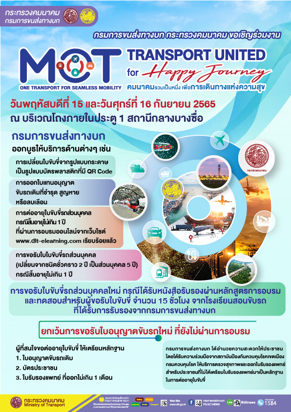 กรุงเทพฯ 13 ก.ย.-กรมการขนส่งทางบกและสถาบันป้องกันควบคุมโรคเขตเมือง (สปคม.) กรมควบคุมโรคกระทรวงสาธารณสุข เข้าร่วมกิจกรรมให้บริการด้านใบอนุญาตขับรถ ในงาน “Transport United for Happy Journey : คมนาคมรวมเป็นหนึ่ง เพื่อการเดินทางแห่งความสุข” ณ สถานีกลางบางซื่อ ระหว่างวันที่ 15 – 16 กันยายน 2565 ณ สถานีกลางบางซื่อ
