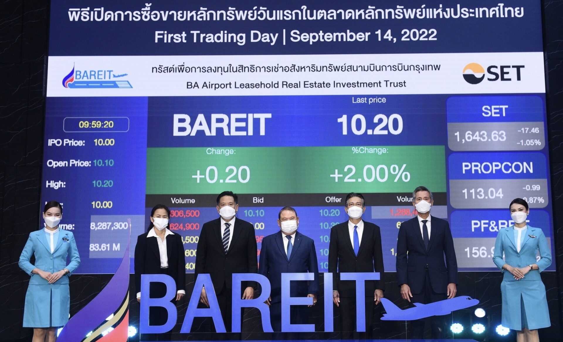 นางสาวลีฬภัทร ลีฬหวณิช กรรมการผู้จัดการ บริษัท กรุงเทพ รีทแมเนจเมนท์ จำกัด ในฐานะผู้จัดการกองทรัสต์ กล่าวว่า ได้นำหน่วยทรัสต์ของทรัสต์เพื่อการลงทุนในสิทธิการเช่าอสังหาริมทรัพย์สนามบินการบินกรุงเทพ เข้าทำการซื้อขายวันแรกในตลาดหลักทรัพย์แห่งประเทศไทยในวันที่ 14 กันยายน 2565 โดยใช้ชื่อย่อ ‘BAREIT’ ในการซื้อขายบนกระดานหลักทรัพย์ฯ ซึ่งคาดว่านักลงทุนจะให้การตอบรับที่ดีเช่นเดียวกับในช่วงการเสนอขายหน่วยทรัสต์ที่ผ่านมา