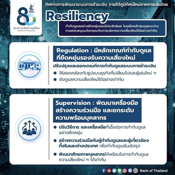 3. การกำกับดูแลที่ยืดหยุ่นและเท่าทัน (Resiliency) โดยมุ่งเน้นความมีประสิทธิผลและไม่ก่อให้เกิดความเสี่ยงเชิงระบบในวงกว้าง แผนงานสำคัญ ได้แก่ 1) การทบทวนหรือปรับปรุงกรอบหลักเกณฑ์การกํากับดูแลตามแนวทาง Regulatory Impact Assessment (RIA) ให้ยืดหยุ่นและสอดรับกับการเปลี่ยนแปลงของระบบการชำระเงิน 2) การออกหลักเกณฑ์ด้านการชำระเงินเพื่อรองรับเทคโนโลยีและความเสี่ยงใหม่ เช่น การกำกับดูแลนวัตกรรมการชำระเงินต่าง ๆ 3) การปรับแนวทางและเครื่องมือการกำกับดูแลให้เท่าทันสภาพแวดล้อมและความเสี่ยงใหม่ ๆ เช่น การนำเทคโนโลยีมาใช้พัฒนาเครื่องมือกำกับตรวจสอบ (supervisory technology) 4) การพัฒนาความร่วมมือกับหน่วยงานกำกับดูแล ผู้ให้บริการ และหน่วยงานที่เกี่ยวข้องทั้งในและต่างประเทศอย่างต่อเนื่อง เพื่อสร้างองค์ความรู้และร่วมกันแก้ปัญหาอย่างทันท่วงที และ 5) การพัฒนาศักยภาพบุคลากรเพื่อรองรับการเปลี่ยนแปลง