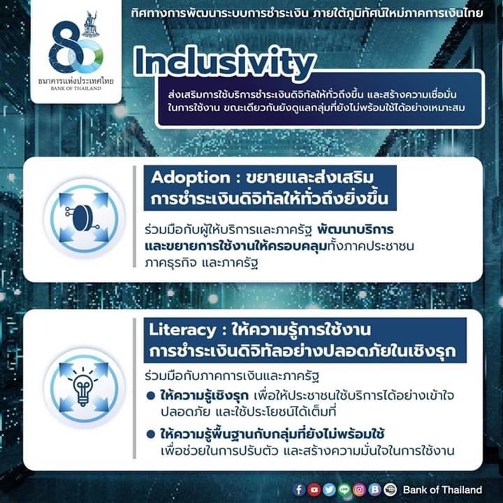 2. การเข้าถึงและเข้าใจการใช้บริการชำระเงินดิจิทัล (Inclusivity) โดยมีเป้าหมายให้ประชาชนทุกกลุ่มเข้าถึงบริการชำระเงินดิจิทัลได้อย่างทั่วถึงในวงกว้าง เพื่อผลักดันให้การชำระเงินดิจิทัลเป็นทางเลือกหลักของคนไทย โดยจะดำเนินการร่วมกับภาครัฐ ภาคเอกชน และผู้ให้บริการชำระเงินที่สำคัญ ในการขยายการชำระเงินดิจิทัลให้ตรงกับความต้องการของผู้ใช้บริการ อาทิ การชำระเงินดิจิทัลในการให้บริการระบบขนส่งสาธารณะ การต่อยอดบริการชำระเงินดิจิทัลกับแอปพลิเคชันภาครัฐที่ครอบคลุมการใช้งานในวงกว้าง รวมทั้งการเร่งสร้างความรู้ความเข้าใจการใช้บริการชำระเงินดิจิทัลอย่างถูกต้องและปลอดภัยให้กับกลุ่มเป้าหมายอย่างต่อเนื่อง