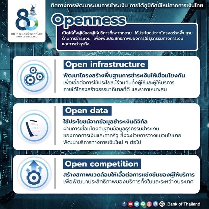 1. การเปิดกว้างให้เกิดการใช้ประโยชน์ร่วมกัน (Openness) จะเน้นการใช้ประโยชน์จากโครงสร้างพื้นฐานและข้อมูลด้านการชำระเงินร่วมกันของภาคส่วนต่าง ๆ มากขึ้น เพื่อเพิ่มประสิทธิภาพ ส่งเสริมการแข่งขันและการพัฒนานวัตกรรม รวมถึงการเพิ่มบทบาทด้านการชำระเงินของไทยในเวทีสากล โดยแผนงานสำคัญ ได้แก่ 1) การพัฒนาโครงสร้างพื้นฐานเพื่อส่งข้อมูลทางการค้าและการชำระเงินดิจิทัลของภาคธุรกิจอย่างครบวงจร (ระบบ PromptBiz) 2) การยกระดับการนำมาตรฐานสากลและมาตรฐานกลางมาใช้ในระบบการชำระเงิน เช่น มาตรฐาน ISO20022 มาตรฐานการเชื่อมโยงระหว่างระบบและผู้ให้บริการ (Application Programming Interface: API) เป็นต้น 3) การมีโครงสร้างด้านธรรมาภิบาลของระบบการชำระเงินที่เหมาะสม เพื่อรองรับพัฒนาการด้านการชำระเงินที่เกิดขึ้นอย่างรวดเร็ว 4) การพัฒนาฐานข้อมูลการชำระเงินภายใต้โครงการ Regulatory Data Transformation (RDT) และการบูรณาการข้อมูลชำระเงินร่วมกับภาครัฐเพื่อเพิ่มประโยชน์ในการใช้ข้อมูลในวงกว้าง และ 5) การมีหลักเกณฑ์ที่เอื้อให้เกิดการเข้าถึงโครงสร้างพื้นฐานด้านการชำระเงินที่สำคัญ
